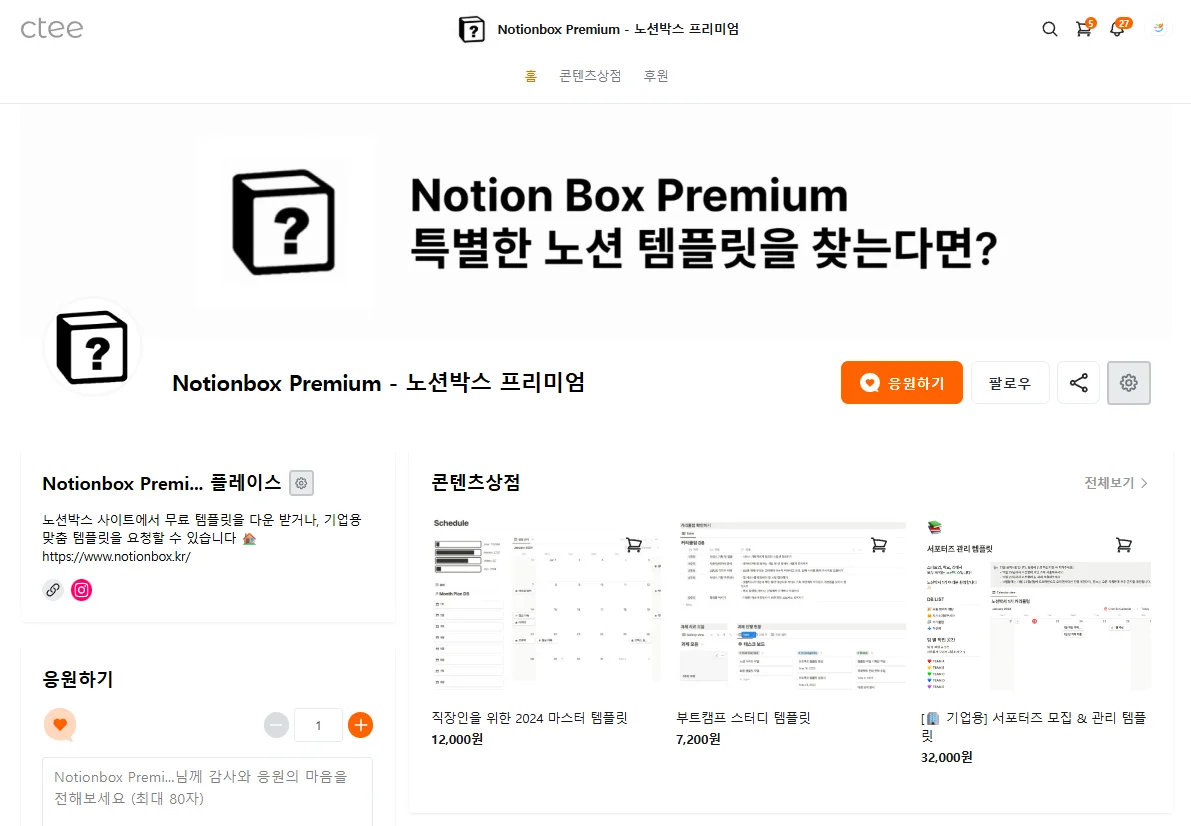 ‘노션박스 프리미엄’은 이 시장에서 프리미엄 템플릿을 제작·판매하며, 무료 템플릿도 함께 운영해 폭넓은 유저층을 보유한 크리에이터입니다.