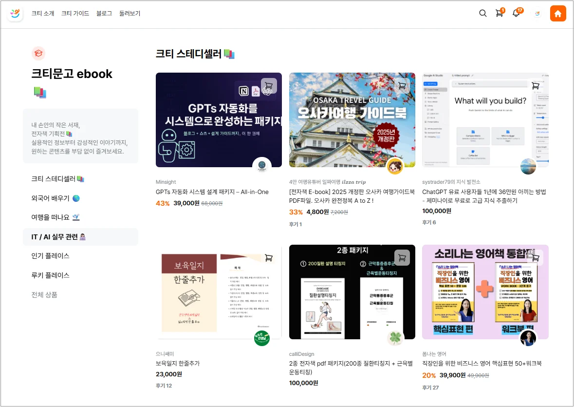 *전자책 상품을 올리고 등록된 크티 ‘ebook’ 기획전에서 자연스러운 구매자 유입