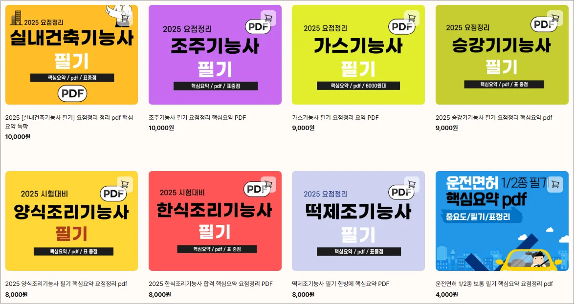 기능사 및 다양한 자격증 시험을 준비하는 분들을 위해 요약·정리 자료를 제작·판매하고 있고, 현재는 크티와 크몽 등 파일 판매 플랫폼을 중심으로 활동하고 있습니다.