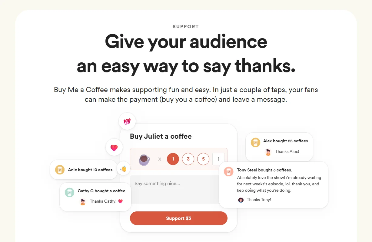 Buy Me a Coffee를 사용하는 크리에이터들은 주로 다음 3가지 방식으로 수익을 얻습니다.