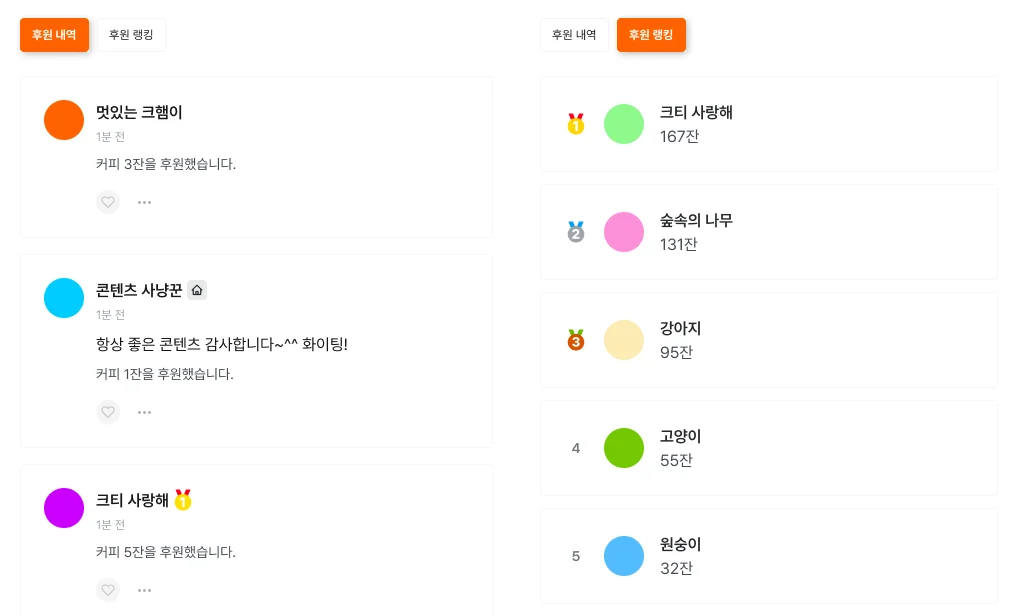 팬 데이터 완전 소유 : 누가 나를 가장 많이 후원했는지(팬 랭킹) 데이터를 내가 직접 관리할 수 있어, 추후 후원자 전용 이벤트 등 비즈니스 확장이 가능합니다.