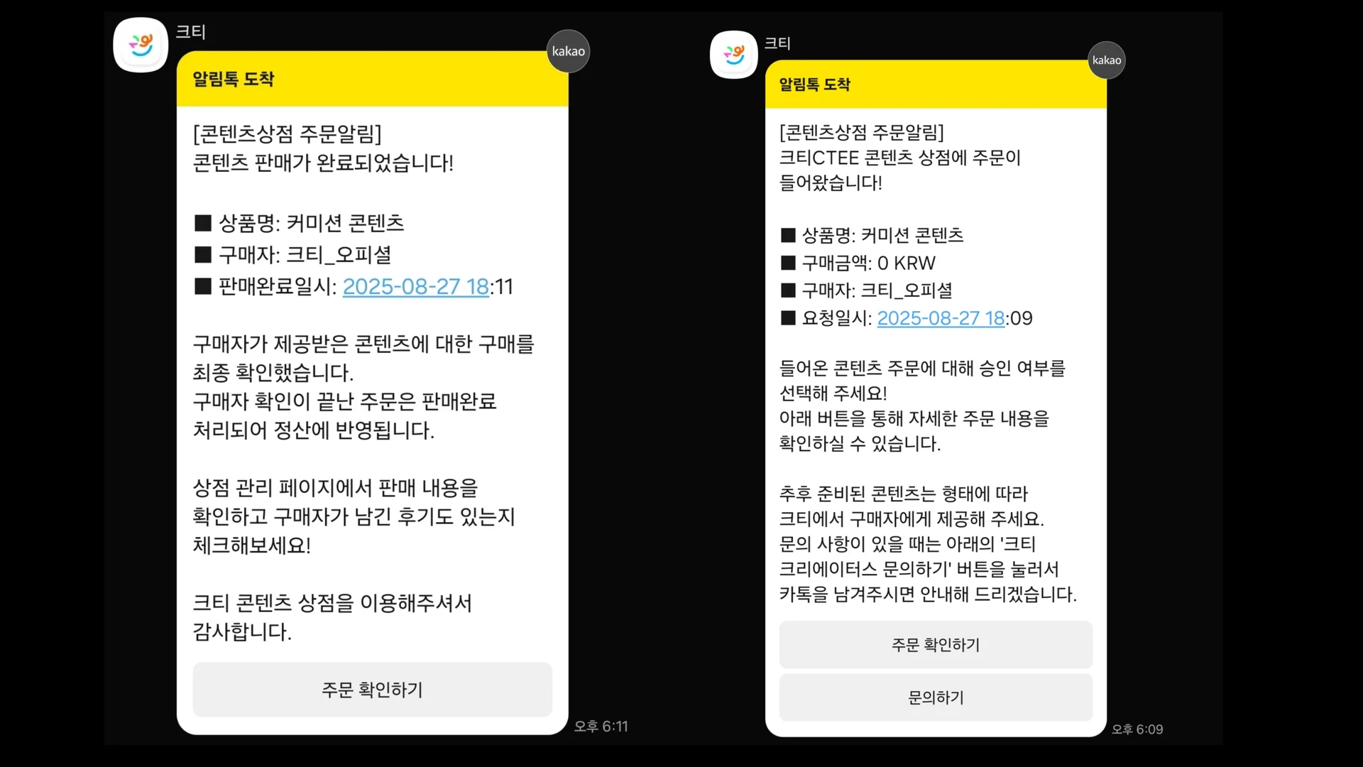 그리고, 가장 중요한 것! 팬들이 작업을 의뢰하고, 승인하여 정산되는 과정을 모두 카카오톡으로 받아볼 수 있어요!
