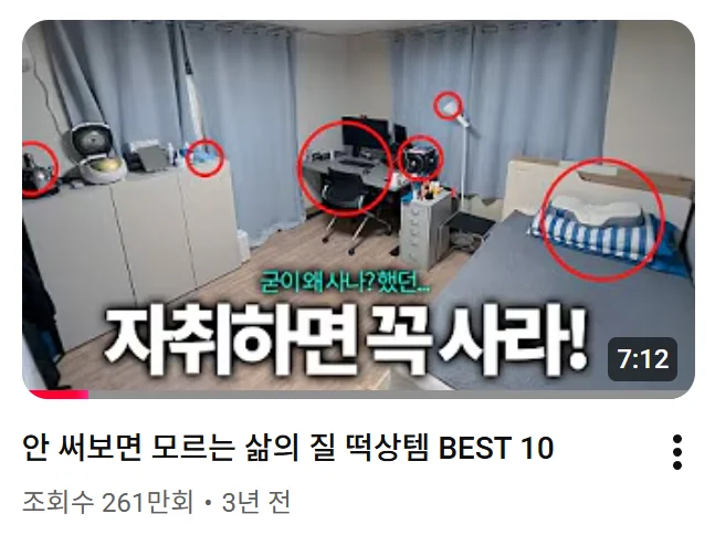 예를 들면 자취템 추천, IT 기기 비교 같은 영상들이죠. 기획도 상대적으로 빠르고, 검증된 포맷이기 때문에 조회수도 안정적으로 나오는 편이에요.