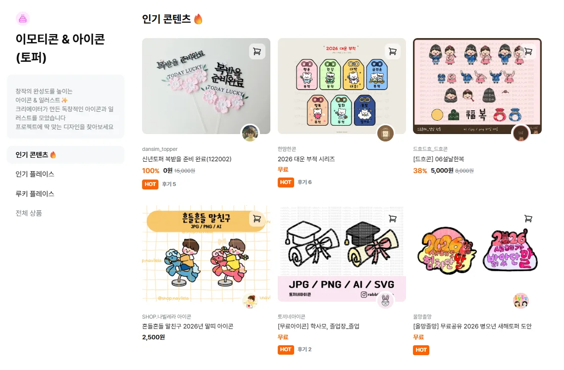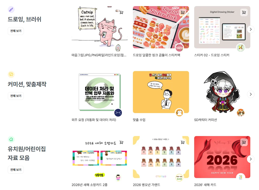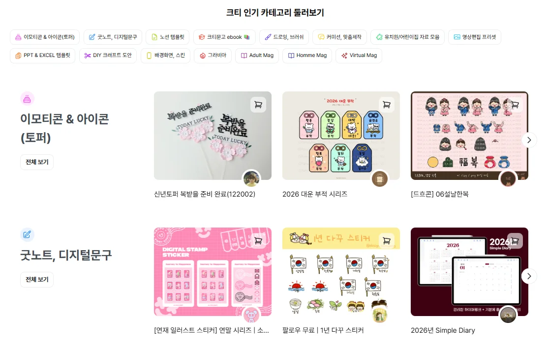 그 크리에이터들의 팬들이 자연스럽게 유입되며 콘텐츠를 둘러보고 구매하는 흐름이 만들어져 있습니다.