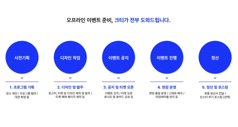 장소 대관 → 기획 → 디자인 → 티켓팅 → 운영 → 정산